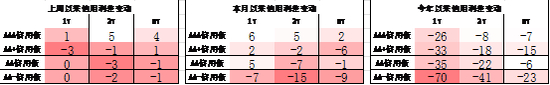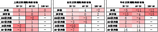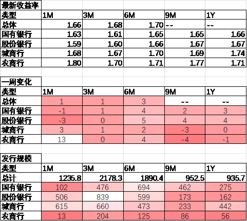 同业存单方面,上周发行利率有所上行,其中发行规模最多的3M股份银行维持不变,为1.60%;6M国有银行上行4BP,为1.65%。