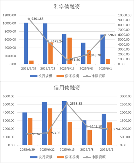 债券融资方面,上周利率债净融资额9301.85亿,维持大额净发行;信用债净融资额691.67亿,较此前有所回落。上周债券净发行量有所回升。