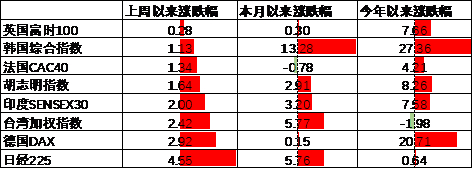 其他海外市场方面,英国市场涨0.28%,表现最差;日本市场涨4.55%,表现最好。新兴市场较发达市场表现占优。