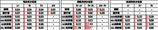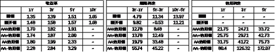 期限利差方面,上周利差大体走阔,30年国债利率升至1.85,大部分券种期限利差维持较低分位数区间。