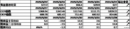 进出口数据方面,上周出口运价走强,同时韩国6月前二十日出口数据有所回升。