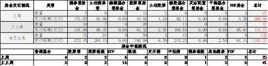 基金申报与发行方面,上周共计申报基金25支,其中普通混合型基金4支,债券类基金(3支)少于股票类基金(15支),FOF基金申报3支。发行一边,上周基金共计发行260.09亿,其中股票型基金发行规模有所回落。