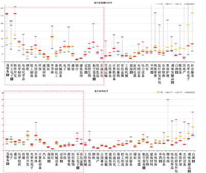 分行业看,预测PE约二分之一行业高于过去5年估值中位数,PB方面约四分之一行业高于过去5年估值中位数,电子、计算机、军工估值相对较高。