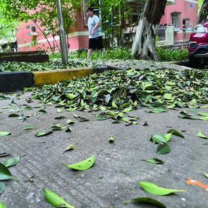 “前天晚上下了雨,早上起来就发现掉了很多叶子,当时还以为是雨打下来的,就没有在意。”家住九龙坡区朵力名都小区的宋先生说,昨天早上出门时发现清洁工在清扫小叶榕的叶子,下午回来发现地上又掉了厚厚一层落叶。清洁工告诉他,白天要清扫三次以上,但是还赶不上落叶的速度。