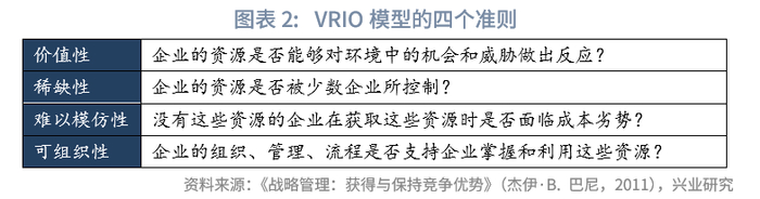 资源基础观的核心是VRIO模型。鉴于VRIO和VRIN均是由巴尼所提出,并且VRIO模型是对VRIN模型的更新,因此本报告主要对VRIO模型进行介绍。