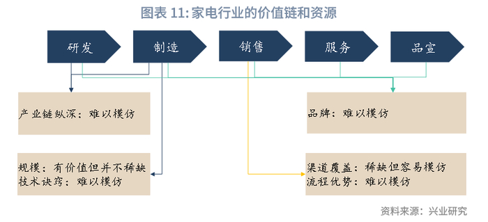 家电企业价值链主要由研发、制造、销售、服务、品牌宣传等环节构成,在分析家电企业的竞争力时,需要从这些环节中识别出具有价值、稀缺性和难以替代的资源。
