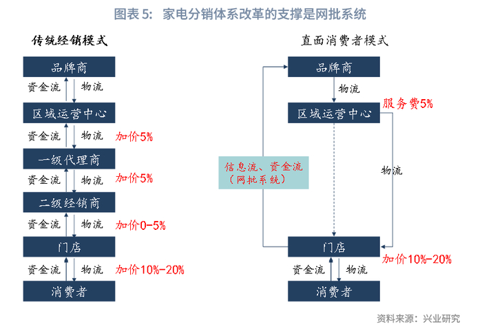 销售流程优势是一种难以模仿的资源。所谓的销售流程,指的是销售过程涉及到的信息流、资金流和物流的流程。传统多级代理销售模式下,信息流和资金流是逐级向上传递,例如门店的购买信息和资金传递到二级经销商,二级经销商的购买信息和资金传递到一级代理商,而物流是按相反的方向逐级向下运输,这就造成了中间环节的多级压货、仓储、运输和加价。在消费渠道改革的背景下,家电企业都追求渠道扁平化,取消中间环节以降低成本。如果原来的层级关系是1个一级经销商管理10个二级经销商,每个二级经销商再管理10个门店,那么在取消二级经销商后,一个一级经销商将直接管理100个门店。这种流程上的调整不是简单的取消二级经销商,而是需要在信息流、资金流和物流等方面进行全新的安排。因此,数字化系统和物流系统的支持成为渠道扁平化的关键支撑,而数字化系统和物流系统是一种难以复制的资源。