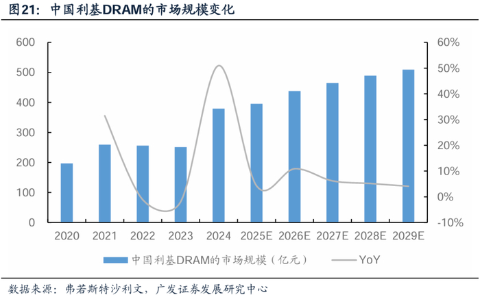 根据弗若斯特沙利文的数据,2024年,中国利基DRAM市场规模379亿元,同比增长%,占全球市场64%;预计到2029年,行业市场规模有望扩增至509亿元,2024-2029年CAGR为6.1%,快于全球增速水平。