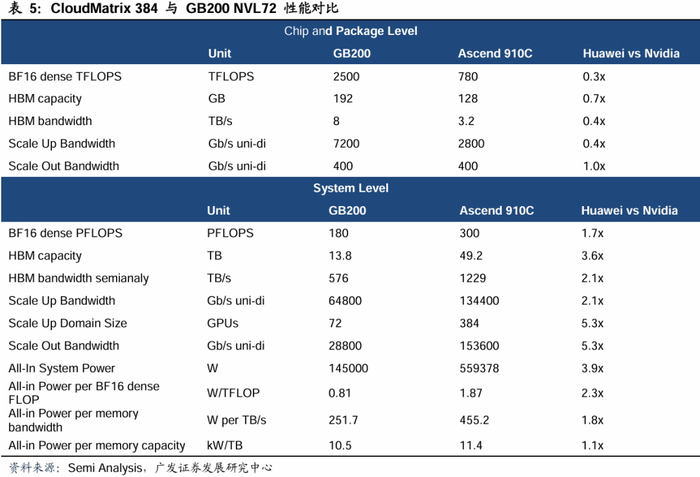 在2025年4月10日的华为云生态大会上,华为正式发布CloudMatrix 384超节点。CloudMatrix 384由384颗昇腾910C芯片通过全连接拓扑结构互联而成。根据Semi Analysis的数据,CloudMatrix 384 算力总规模达300 Pflops(BF16 dense),是英伟达NVL72的1.7倍;HBM总容量达49.2TB,是NVL72的3.6倍;总内存带宽达1229TB/s,是NVL72的2.1倍。根据华为官方公众号数据,结合华为在ICT领域的技术积累及工程经验,华为可以将多个384超节点组成十万卡级的Atlas 900 SuperCluster超节点集群以支持更大规模的模型训练需求,在客户的昇腾超节点实测中,LLaMA3等千亿稠密模型性能可达传统集群的2.5倍以上。DeepSeek、Qwen等多模态、MoE模型上,可以达到3倍以上的提升。