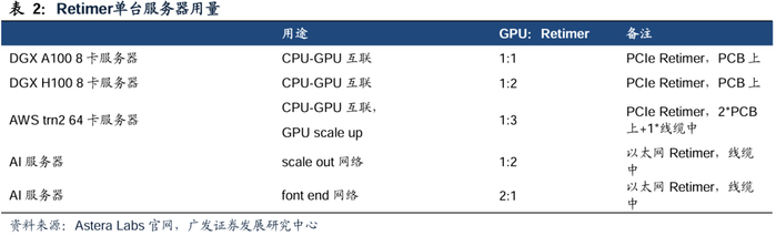 PCIe Retimer市场规模测算。我们参照Astera Labs官网的配置图,总结出:在DGX A100 8卡服务器中,GPU和Retimer比例为1:1;在DGX H100 8卡服务器中,GPU和Retimer比例为1:2;在AWS trn2 64卡服务器中,GPU和Retimer比例为1:3。