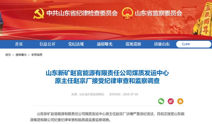 【山东省纪委监委通报,赵宗厂接受审查调查】据山东省纪委监委消息:山东新矿赵官能源有限责任公司煤质发运中心原主任赵宗厂涉嫌严重违纪违法,目前正接受山东能源集团有限公司纪委纪律审查和临邑县监委监察调查。
