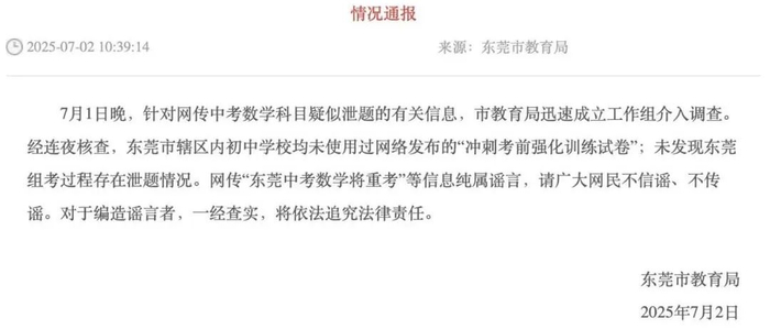 【中考数学疑似泄题?一地教育局最新通报】6月30日,2025年东莞中考开考。7月1日下午,数学科目开考,当晚网络上流传出“疑似数学科目泄题”“东莞中考数学重考”等信息。