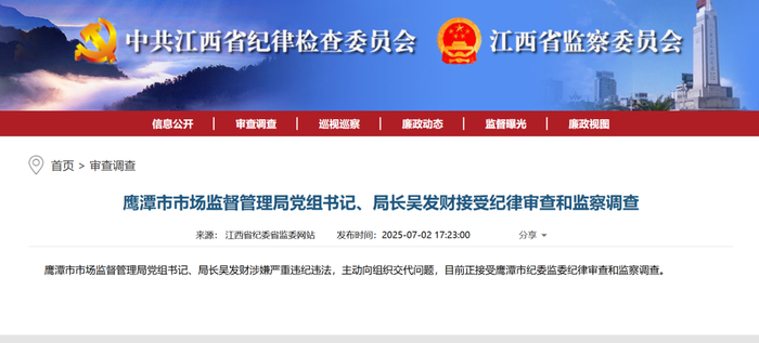 【吴发财,主动交代问题】据江西纪检监察网7月2日消息,鹰潭市市场监督管理局党组书记、局长吴发财涉嫌严重违纪违法,主动向组织交代问题,目前正接受鹰潭市纪委监委纪律审查和监察调查。