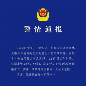 2025年7月1日10时22分,长春市二道区吉林大路与洋浦西街交汇处发生一起刑事案件。南航吉林分公司员工李某某(男,31岁)因工作纠纷,将同事黄某(男,52岁)、李某(男,47岁)扎伤后跳楼身亡。黄某、李某经送医救治,无生命危险。目前,案件正在进一步侦办中。
