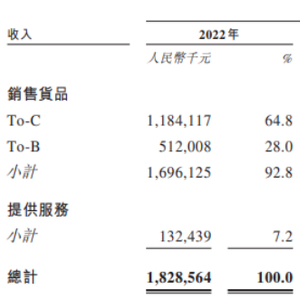 收入明细来看,销售货品的收入在报告期内出现连续下滑的情况,分别为16.96亿、15.88亿、15.56亿,其中营收占比超五成的To-C业务的收入由2022年的11.84亿逐年下滑至2023年的10.31亿、2024年的9.74亿,营收占比也从2022年的64.8%来到2024年的57.3%;To-B业务收入则出现一定增长,由2022年的5.12亿增至2024年的5.82亿。