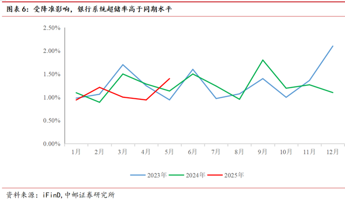 我们测得2025年5月超储率1.40%,高于过去两年同期水平。推测超储回升有以下几点原因,一是5月信贷投放环比改善较为明显,但同比来看仍然同比少增,释放一部分超储;二是央行降低存款准备金,对于超储形成一定补充。