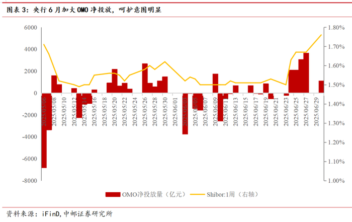 央行层面,5月至今基础货币维持净投放,同时在6月两次提前公告买断式逆回购招标总量情况,呵护资金面意图明显。5月OMO净投放资金448亿元,25日续作MLF5000亿元,净投放3750亿元,5月末买断式逆回购净回笼2000亿元,继续暂停买卖国债操作,截至6月30日OMO大幅净投放。6月在财政供给压力偏大背景下,买断式逆回购及MLF净投放较多资金。7月作为传统存贷小月,银行资负两端压力或较小,但仍需关注保险预定利率下调前冲量对银行中长期存款的冲击,根据财联社报道“保险产品预定利率调降最早或于三季度启幕”。