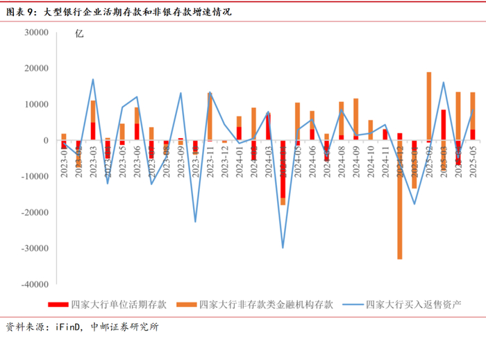 超储率等:我们测得2025年5月超储率1.40%,高于过去两年同期水平;录得5月大型银行NSFR为107.35%,连续5个月份低于2023年和2024年同期,预计6月NSFR或季节性上行。