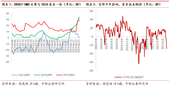 5月24日-6月28日,银行间资金中枢相较于去年更高但走势更为平稳。从DR007-OMO利率来看,5月下旬受存款利率下调,居民和企业活期存款向非银机构迁移影响,5月下旬资金面整体趋于收敛,6月以来受央行呵护市场影响,提前续作3个月和6个月买断式逆回购,叠加PMI反应的基本面偏弱影响(6月制造业PMI在荣枯线以下),银行间资金利率震荡下行,6月下旬受银行季末指标考核和跨半年影响,隔夜资金维持平稳,跨月资金震荡上行。