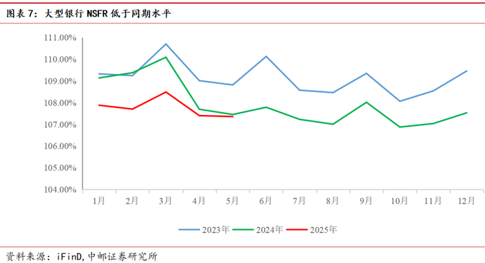 我们录得5月大型银行NSFR为107.35%,连续5个月份低于2023年和2024年同期,推测原因是资产端中长期贷款和长期限债券投资比重上升,负债端则是居民存款流向中小银行非银造成核心存款比重下降。NSFR为季度考核,预计6月NSFR或季节性上行。