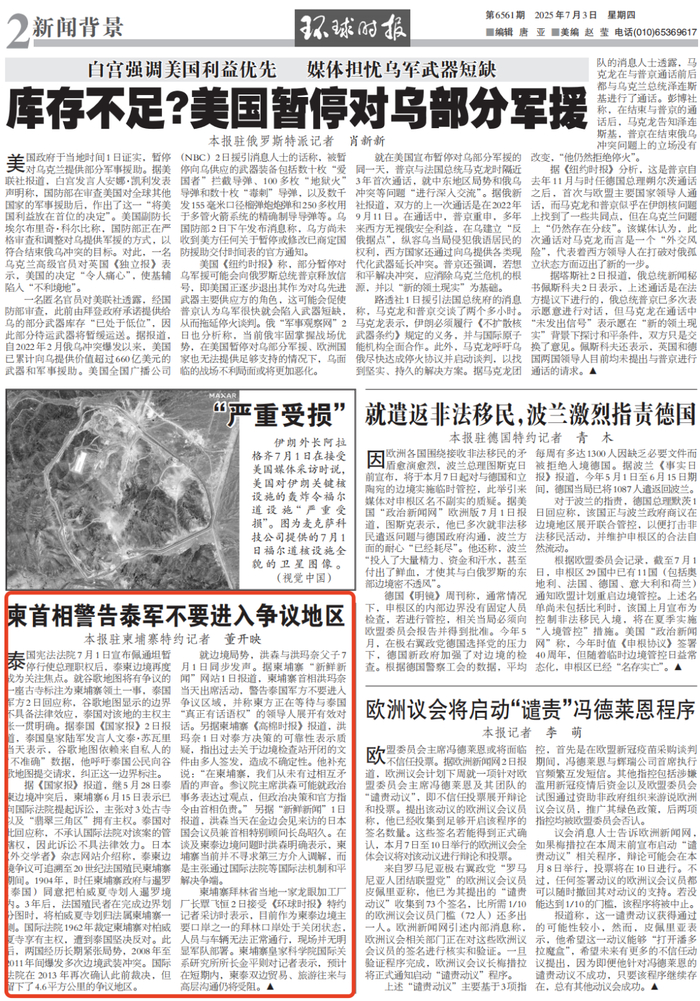 泰国宪法法院7月1日宣布佩通坦暂停行使总理职权后,泰柬边境再度成为关注焦点。就谷歌地图将有争议的一座古寺标注为柬埔寨领土一事,泰国军方2日回应称,谷歌地图显示的边界不具备法律效应,泰国对该地的主权主张一贯明确。据泰国《国家报》2日报道,泰国皇家陆军发言人文泰·苏瓦里当天表示,谷歌地图依赖来自私人的“不准确”数据,他呼吁泰国公民向谷歌地图提交请求,纠正这一边界标注。