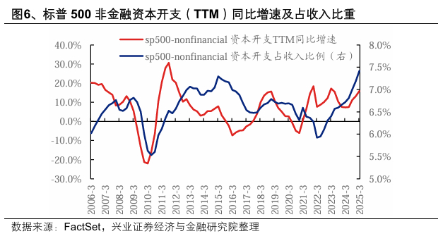 标普500非金融资本开支同比增速及占收入比重继续上行。
