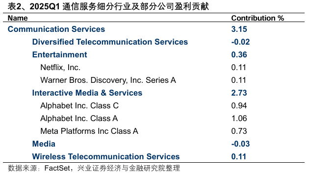 科技龙头支撑下,TMT行业盈利增长较快。1)2025Q1信息技术保持较快增长,净利润同比增速为17.3%,其中半导体净利润同比增速为28.9%、软件净利润同比增速为19.7%,是拉动增长的主要贡献者,英伟达、微软贡献大。2)通信服务行业净利润同比增速为41.6%,细分行业中互动媒体服务仍是主要贡献,净利润同比增速达到43.5%,最大贡献来自于谷歌、Meta。