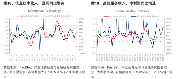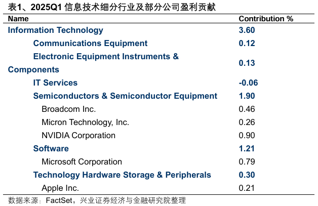 2025Q1信息技术保持较快增长,收入同比增速为13.1%,净利润同比增速为17.3%,其中半导体净利润同比增速为28.9%、软件净利润同比增速为19.7%,是拉动增长的主要贡献者,英伟达、微软贡献大。
