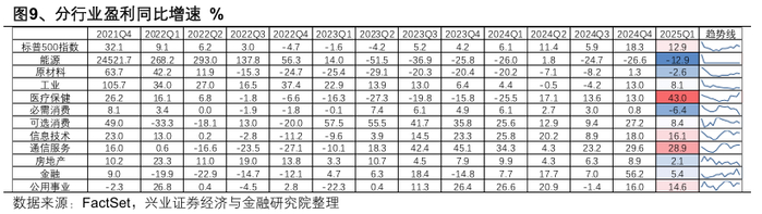 从对标普500盈利同比增速贡献的角度来看,2025Q1,医疗保健、信息技术、通信服务贡献较大。相比2024Q4,医疗保健、工业、公用事业、通信服务、能源对标普500盈利同比增速的贡献上升。