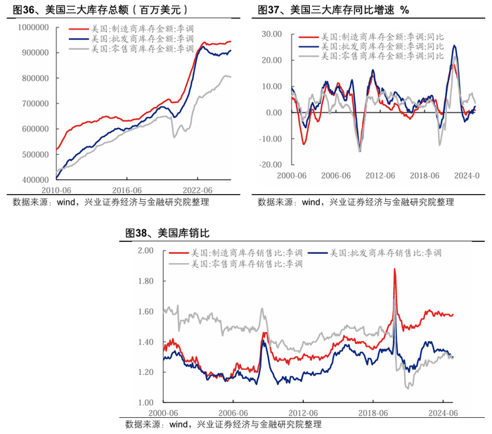 从名义库存规模及同比增速看,批发商和制造商补库明显,而零售商在2024年补库较多,于2024年11月率先进入去库阶段,当前未明显补库。从库销比的角度上,批发商和零售商库销比整体仍在回落。所以若后续对等关税落地,零售商提价或成为大概率事件。