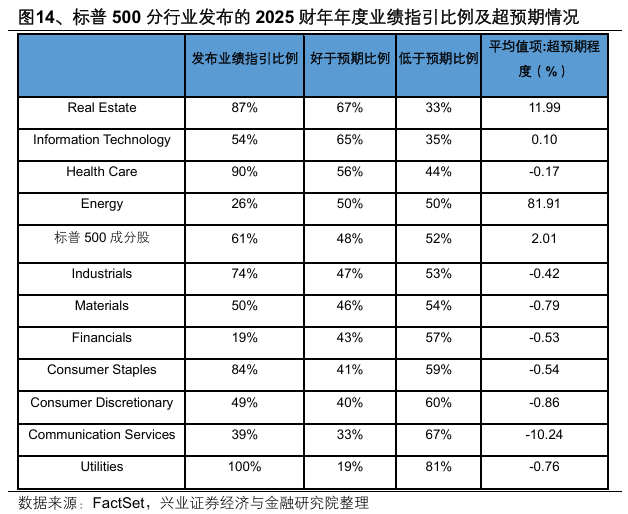 截至2025年6月5日,标普500成分股中有61%的公司发布2025财年业绩指引,25%的公司发布了下个季度的业绩指引。年度指引好于预期的比例为48%,季度指引好于预期的比例为49%。