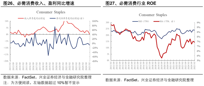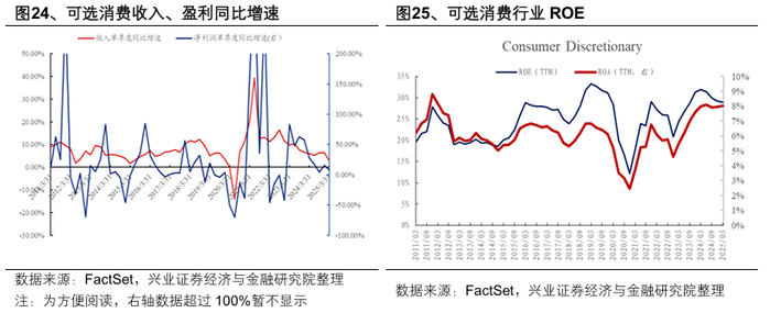 整体来看,美股消费行业业绩仍承压。无论是可选消费还是必需消费,收入、净利润同比增速较2024Q4均有所下滑,ROE水平也有所下降。