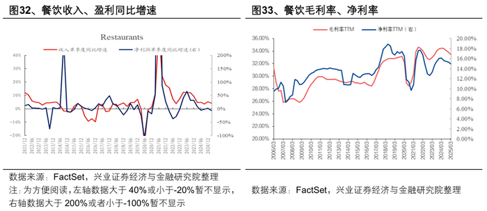 服务消费景气有所走弱。2025Q1餐饮收入、净利润同比增速下降,毛利率净利率高位回落;2025Q1酒店旅游收入同比增速回落,向疫情前正常区间靠拢,盈利能力仍处在较高水平。