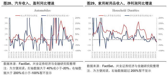 商品消费特别是耐用品消费业绩较差,例如汽车、家用耐用品。2025Q1,汽车收入同比增速转负为-2.9%,净利润同比增速为-36.2%,福特、特斯拉是主要拖累。家用耐用品收入同比增速为-4.0%,净利润同比增速为-23.2%,是2018年以来的最低值。