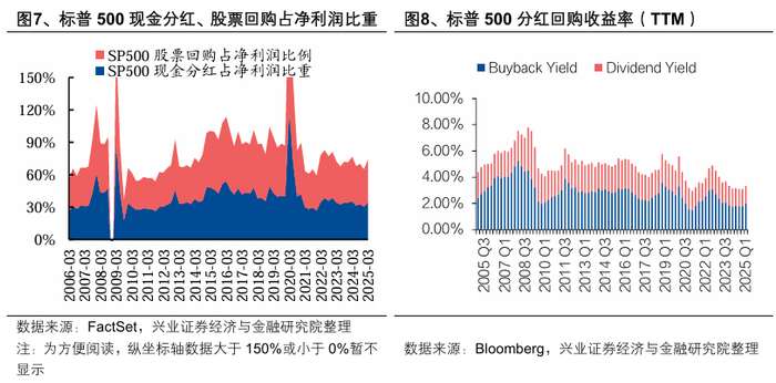 分红和回购比例低于历史中枢水平。标普500 2025Q1现金分红和回购占净利润的比重分别处于最近20年的17.1%和35.5%分位数水平。2025Q1,标普500股息收益率(TTM)1.34%,回购收益率(TTM)为1.99%,分别处于最近20年的5.0%和11.3%分位数水平。