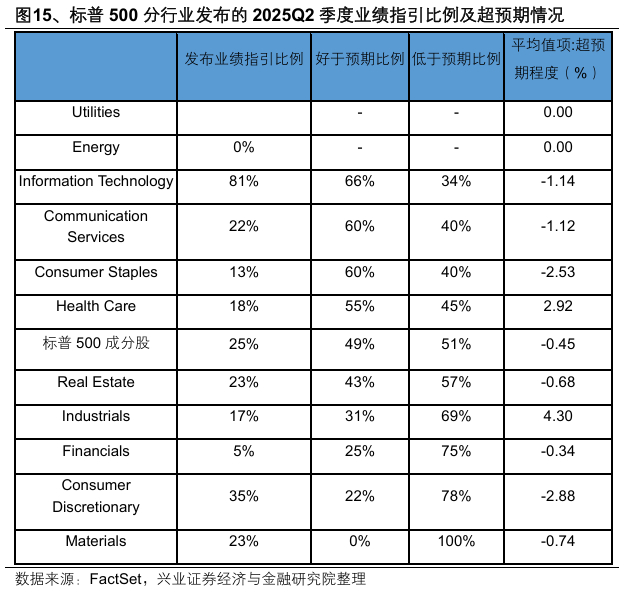 发布季度指引比例较高的行业信息技术,好于预期的比例为66%,平均超预期程度为-1.14%。