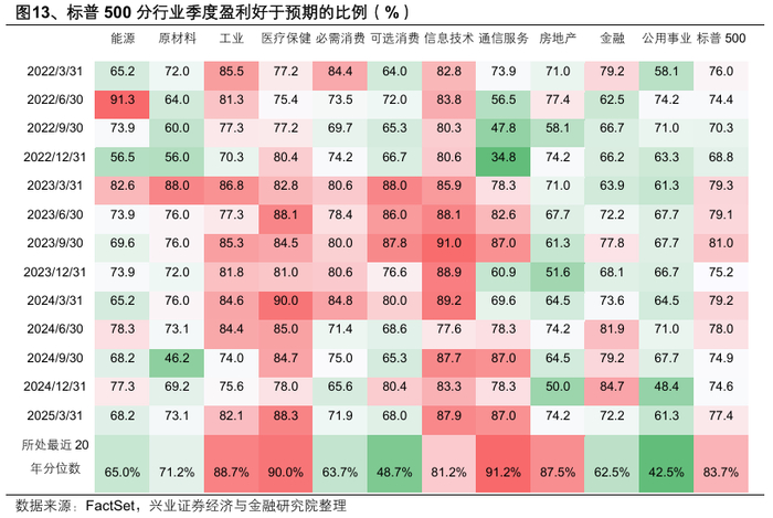 2025Q1,标普500成分股公司中,77.4%的公司盈利好于预期,这一比例处于近20年以来的83.7%分位数。医疗保健(88.3%)、信息技术(87.9%)、通信服务(87.0%)、工业(82.1%)好于预期的比例较高;公用事业、可选消费、能源好于预期的比例较低。