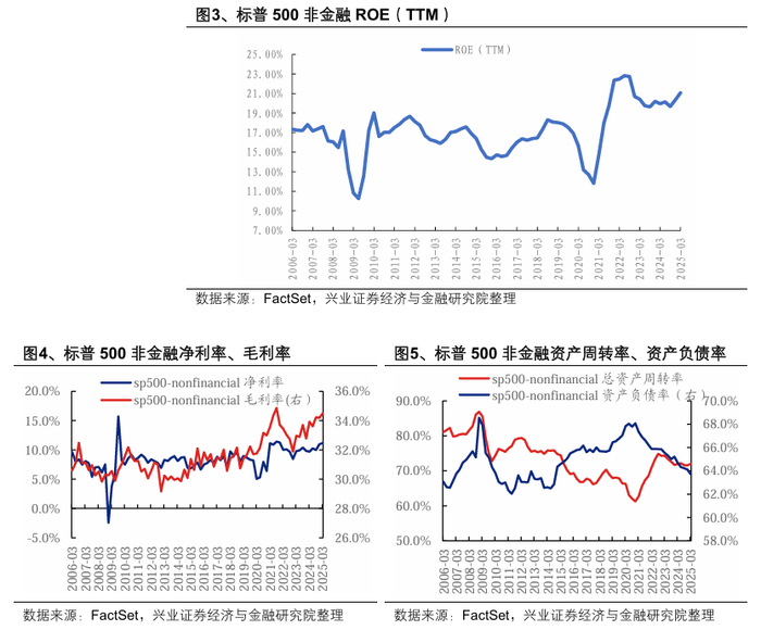 ROE仍处于历史高位水平,净利率和资产周转率高。2025Q1,标普500非金融ROE(TTM)21.1%,处于最近20年的94.7%分位数。净利率为11.2%,较2024Q4继续上升,处于最近20年的96%分位数水平。资产负债继续下降至63.7%,处于最近20年的27.6%分位数。非金融资产周转率(TTM)为71.96%,维持在相对稳定的水平,处于最近20年的39.4%分位数。