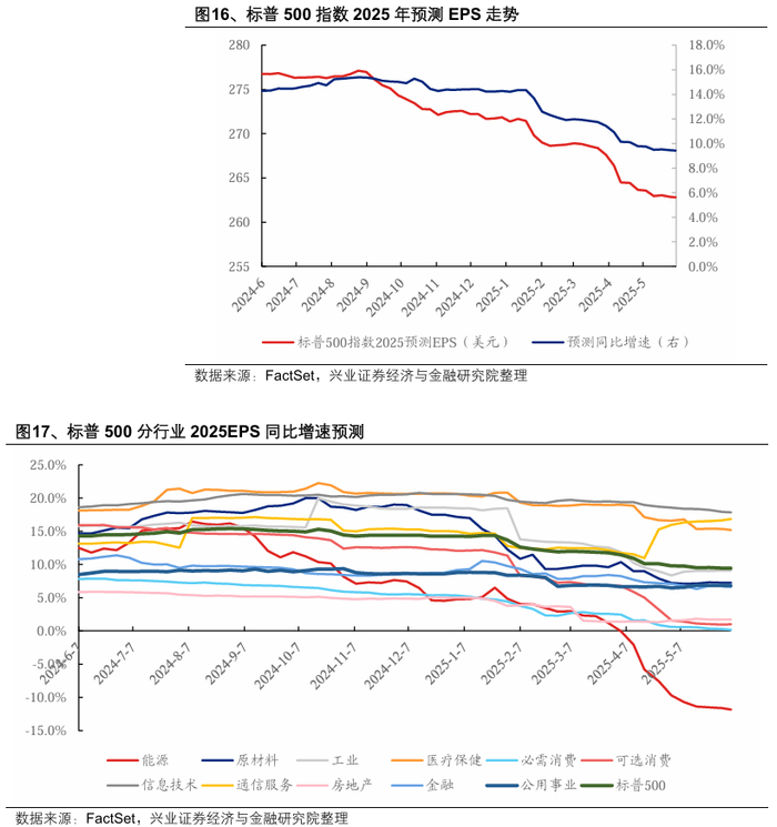 截至2025年6月4日,标普500指数2025年盈利预测同比增速为9.4%。其中预测同比增速较高的是信息技术(+17.8%)、通信服务(+16.8%)和医疗保健(+15.2%)。2025年盈利预测从1月底以来经历了较为明显的下调,其中下调较多的是能源、可选消费、原材料、工业。