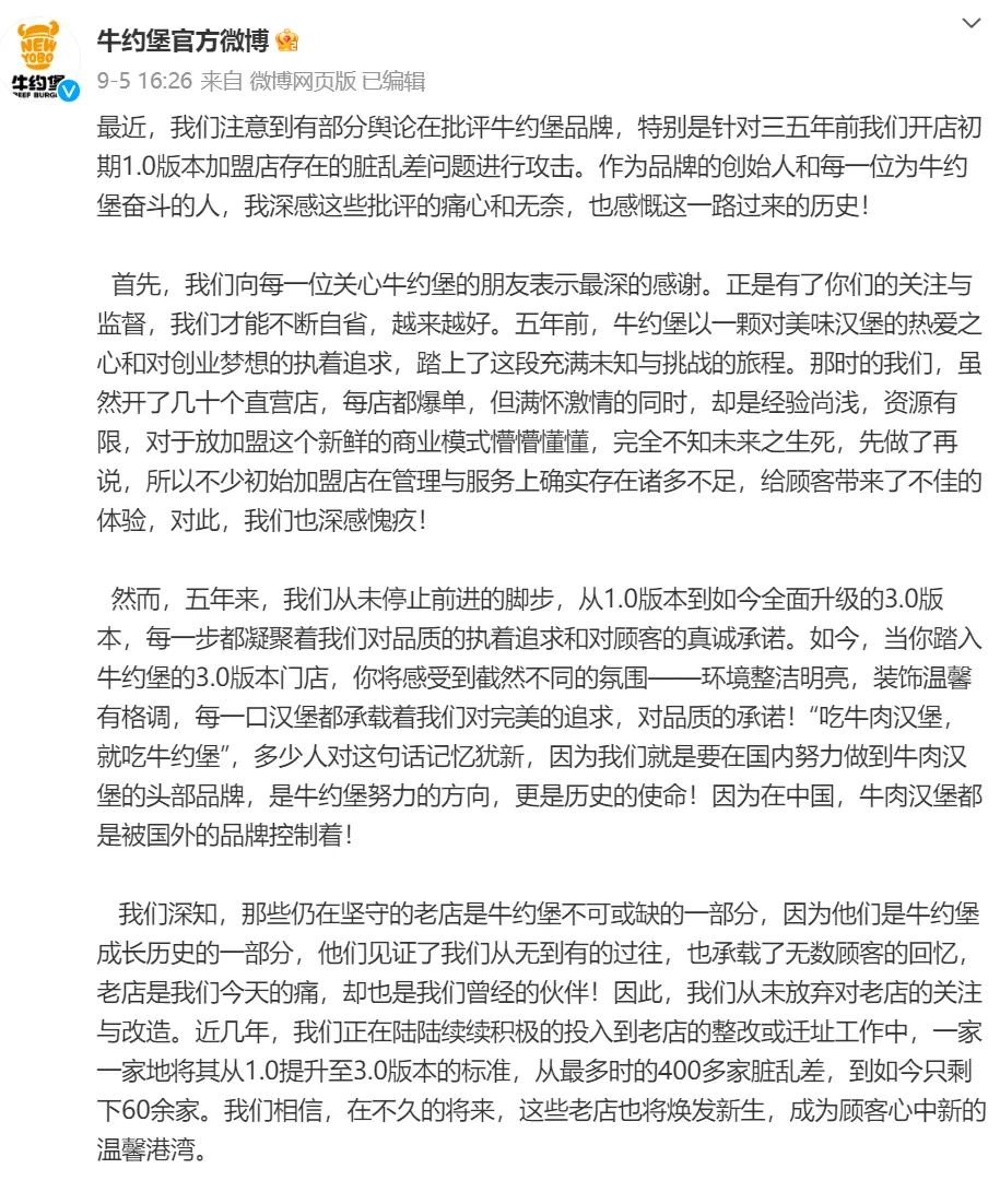 风波发酵后,牛约堡曾2024年9月5日发布数条微博回应食品卫生问题。该品牌承认部分加盟店在管理和服务上存在不足,并表示已在改进。网络上对于其门店环境是食品卫生的指责大都来自于过去旧店和极个别情况,牛约堡正积极投入到老店的整改或迁址工作中,从最多时的400多家脏乱差到如今剩下60余家。