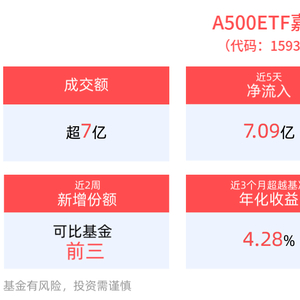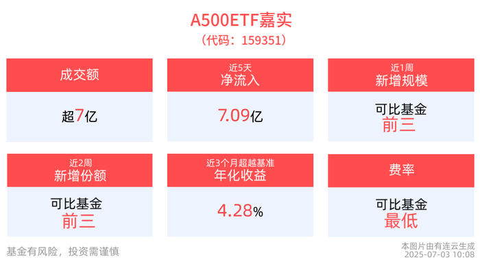 规模方面,A500ETF嘉实近1周规模增长3.19亿元,实现显著增长。份额方面,A500ETF嘉实近2周份额增长12.99亿份,实现显著增长。资金流入方面,拉长时间看,A500ETF嘉实近5个交易日内有3日资金净流入,合计“吸金”7.09亿元。