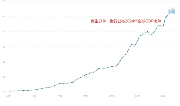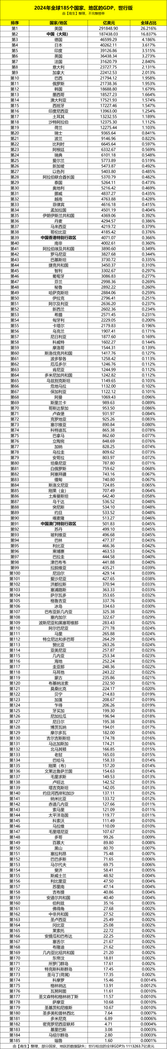 网友们期盼的全球各国、地区的GDP榜单正式成型了——是由世界银行发布的,全球经济总规模在2024年达到了113万亿美元,再创新高。但具体到细节时,世行却仅给出了185个国家、地区的成绩单。