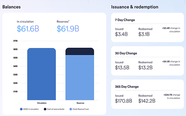 这张图显示了Circle公司发行的USDC 的最新情况。USDC发行量是616亿美金,储备资产是619亿美金。这里面隐含了资产负债的概念。稳定币从发行机构角度相对于负债,为了支持这些负债,需要有储备资产。