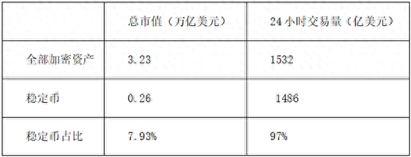 这张表显示了6月24日稳定币市值和交易量。可以看出,稳定币目前市值接近2600亿美金,占全部加密资产市值比例将近8%;稳定币一天交易量在1500美金左右,占全部加密资产交易量能到97%。