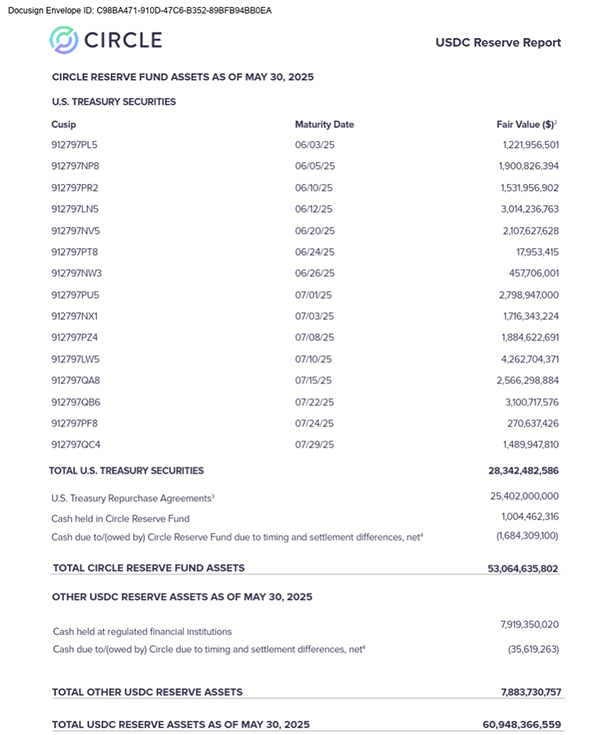 Circle公司将储备资产中的美国国债信息都列出来。5月30日,期限最长的美国国债是7月29日到期。换言之,Circle公司持有的美国国债期限不超过两个月。