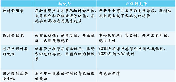 有研究者将微信支付和支付宝视作中国的稳定币。更准确说法是,它们与稳定币都属于e-money。