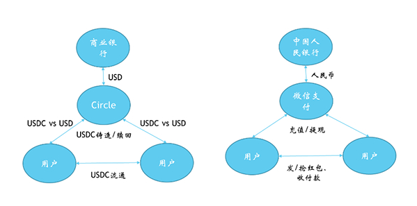 下面这张图对比了稳定币与中国非银行支付的架构。可以看出,尽管它们使用了截然不同的技术,在架构上是类似的: