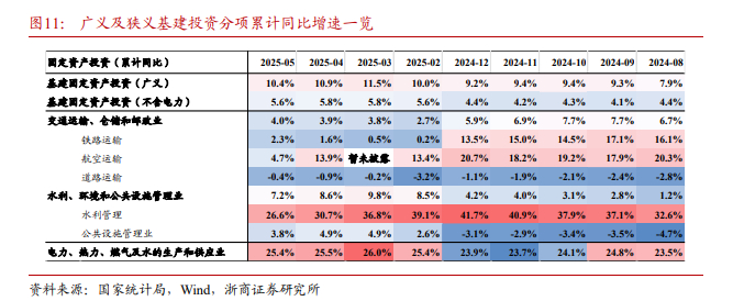 上月情况:2025年1-5月广义基建投资(Wind口径)累计同比增长10.4%,广义基建增速维持较高水平(2024年全年同比增长9.2%)。2025年1-5月狭义基建投资(统计局口径)累计同比增长5.6%,5月当月同比增加5.1%,4月当月同比增长5.8%。分项看,1-5月铁路运输业、道路运输业、水利管理业、公共设施管理业分别累计同比+2.3%、-0.4%、+26.6%、+3.8%。