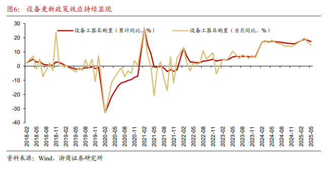 制造业需求保持恢复态势,“两新”政策持续发力拉动国内工业需求,中美关税战豁免期内抢出口(转口)对工业生产有阶段性支撑。据统计局披露,6月份新订单指数为50.2%,比上月上升0.4个百分点,表明制造业市场需求有所改善,新出口订单指数为47.7%,亦较上月有所回升。从内需来看,一方面,大规模设备更新改造和消费品以旧换新对装备制造业的生产仍有较强带动作用;另一方面,随着各地工程项目施工继续加快,建筑业施工带来的工业需求有所支撑。