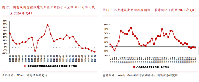 建筑企业订单方面:国有及国有控股建筑业企业新签合同额及上市建筑央企基建订单同比增速领先基建投资大约一个季度。从已经披露的八大建筑央企中看,2025Q1中国中铁、中国铁建、中国交建、中国能建、中国电建、中国中冶、中国建筑(基建)、中国化学新签订单共计30586亿元,同比-2.1%,2024年同比为-1.1%,连续四个季度同比转负,系自2015年以来首次。根据已披露的建筑央企上市公司公告,2025年1-5月中国中冶、中国化学、中国电建、中国建筑(基建)新签合同额累计约16147亿元,同比去年同期-3.1%,对后续相关基建投资落地也形成一定压制,预计2025年整体基建改善幅度和持续性有限。